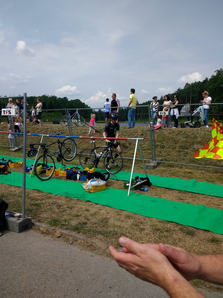 In the car on the way down and the clouds were threatening some rain, maybe the storms that were forecast. By the time we got to Sokołów, however, that had passed. The sun came out and with the Triathlon’s location being down in a valley, the air was pretty still. It made for nice warm conditions and ready for setting up the transition.
