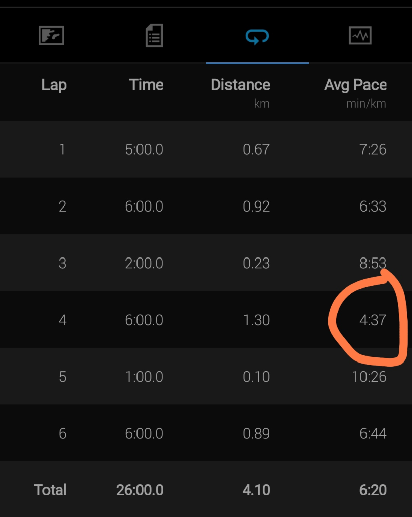 A very similar experience of feeling giving it as much as possible to see where things are. That time I completed the 6-minute time trial with an average pace of 4:36/km.